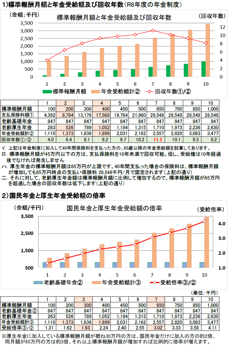 ①支払保険料及び年金受給額は、令和8年度の数字をベースとして計算